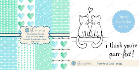 I used the green and white hearts patterned paper from my 'Watercolour Hearts Blue & Green' set of scrapbooking papers and my 'I think you're purr-fect' set of digital stamps.  Both of these are available to buy from my Etsy shop - I also have more heart themed scrapbooking papers in other colours and other Valentine themed digital stamps.